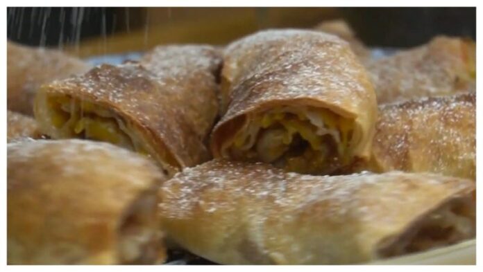 Între timp, se pregătește umplutura: dovleacul și merele se dau pe răzătoare, se amestecă cu zahăr și scorțișoară, apoi se călesc ușor într-o tigaie până își eliberează aroma și devin moi și suculente.